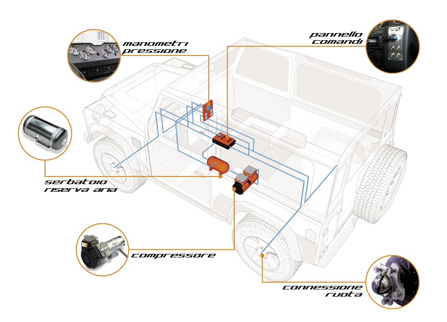 Il nuovo sistema permette di sgonfiare e gonfiare gli pneumatici in modo indipendente l’uno dall’altro, durante la marcia della vettura a qualsiasi velocità e condizione.